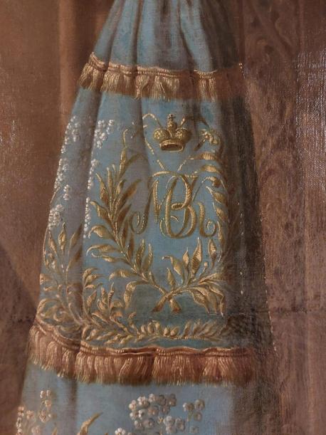 Sacosul în care este înveșmântat e alb, împodobit cu broderie cu motive vegetale aurii. La mâneca mâinii drepte, se observă zurgălăi argintii prinși cu fundițe în aceeași nuanță. În zona coapsei drepte (mai exact sub mâna dreaptă) se observă bedernița sub formă romboidală, brodată tot cu fir auriu, în care este reprezentată icoana Învierii Domnului, mărginită de un chenar brodat cu motive vegetale aurii. La două dintre colțurile laterale ale bederniței se vede câte un canaf mare auriu.